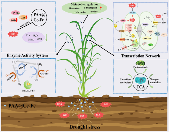 实验显示,经100 mg/L PAA@Ce-Fe纳米酶根施处理后,干旱胁迫下小麦的株高、根长及生物量显著提升,光合速率、蒸腾速率与气孔导度明显恢复,胞间CO2浓度下降,光合效率得到有效改善。同时,叶片中丙二醛和过氧化氢等氧化损伤标志物水平分别降低40.0%和44.0%,超氧化物歧化酶与过氧化氢酶活性分别提升16.8%和18.7%,植株内源抗氧化能力显著增强。