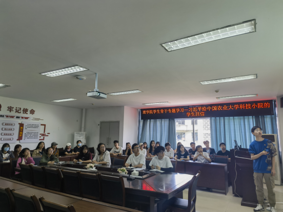 5月4日中午,学院第十届学生组织主要干部于11教305室开展专题学习会,集中学习习近平总书记给中国农业大学科技小院的同学们的回信。会议由学院团委学生兼职副书记李骏威主持,学生骨干30余人参与。