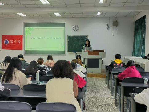 赵珊珊老师分析了学生干部的地位、职责和作用,表示学生干部是学校思想教育和行政管理的第三方面军,担当了重要的责任;其次强调学生干部是学院和学生之间的桥梁、纽带和榜样,是各类学生活动的组织领导者。她指出学生干部在学习与工作时要学会团队合作,合理分工安排,善于取舍和利用资源,勤于请教、总结和学习,这样将有事半功倍的效果。