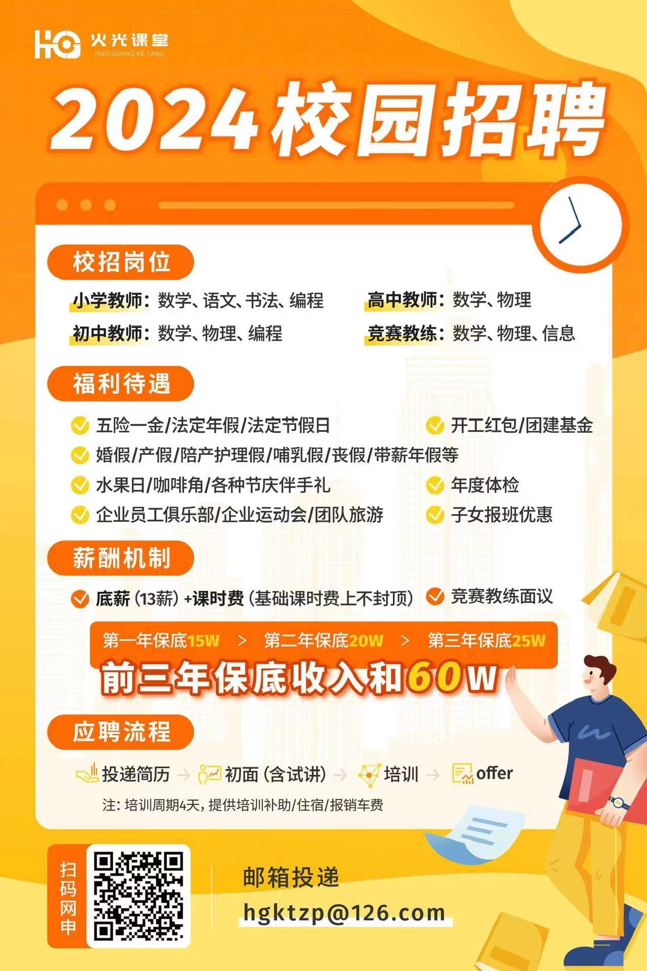 时间:3月19日下午15:00—17:00宣讲地点:1教405教室岗位:小学数学、初中数学、初中物理教师(入职不限专业、不卡教资)薪资:首年15W起(保底15W)简历投递:hgktzp@126.com心中有火,眼里有光,一起闪耀!【重庆江北区耀火光教育培训学校】招贤纳士,聚才揽英,欢迎您的加入~