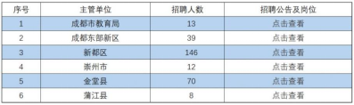 成都市教育局所属事业单位及成都东部新区、新都区、崇州市、金堂县、蒲江县5个区(市)县所属教育事业单位公开考试招聘中小学教师288名,应聘考生可点击查看招聘公告内容、招聘条件岗位表等信息。