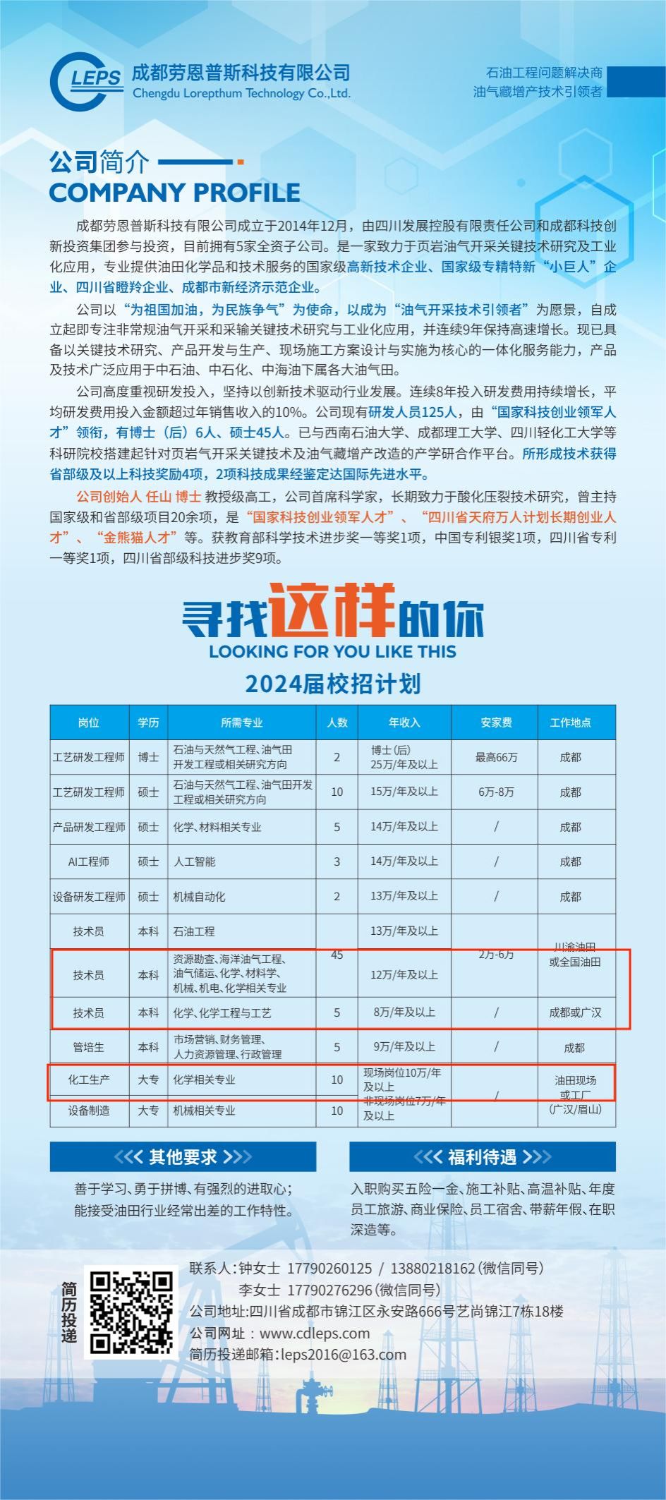 【招聘信息】成都劳恩普斯科技有限公司成立于2014年12月,由四川发展控股有限责任公司和成都科技创新投资集团参与投资,目前拥有5家全资子公司。是一家致力于页岩油气开采关键技术研究及工业化应用,专业提供油田化学品和技术服务的国家级高新技术企业、国家级专精特新“小巨人”企业、四川省瞪羚企业、成都市新经济示范企业。