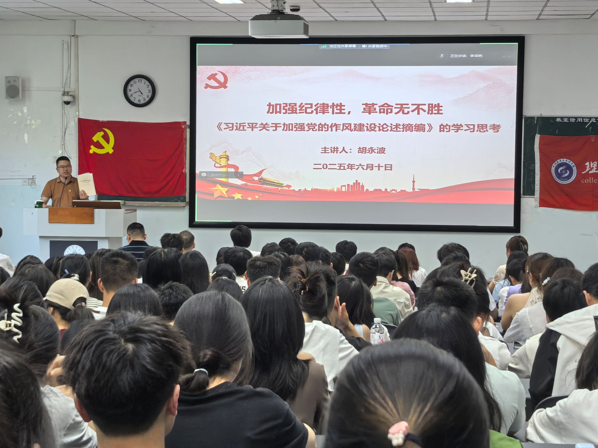 最后,胡永波以“上梁不正下梁歪,中梁不正倒下来”的警示语,强调领导干部需“身体力行、以上率下”,带头践行民主集中制、开展批评与自我批评、严守纪律规矩。他号召全体党员以此次党课为契机,将作风建设成果转化为推动学院发展的实际行动,“像钉钉子一样积小胜为大胜”,以优良党风带动教风学风,为学院事业高质量发展筑牢作风保障。