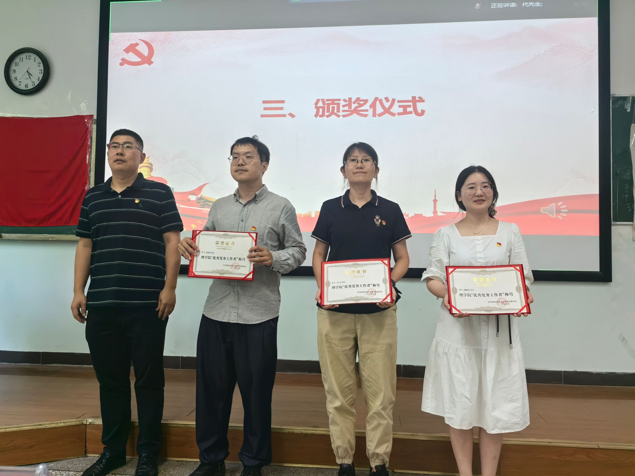 大会第一阶段聚焦“表彰先进·榜样领航”,隆重举行“两优一先”表彰仪式。过去一年,学院各党支部与广大党员在教学科研攻坚、管理服务创新、学生成长成才等领域勇挑重担,涌现出一批事迹突出的先进集体与个人。学院党委委员、院长饶含兵宣读表彰决定后,现场依次为4名“优秀党务工作者”、15名“优秀共产党员”及2个“先进基层党组织”颁奖。