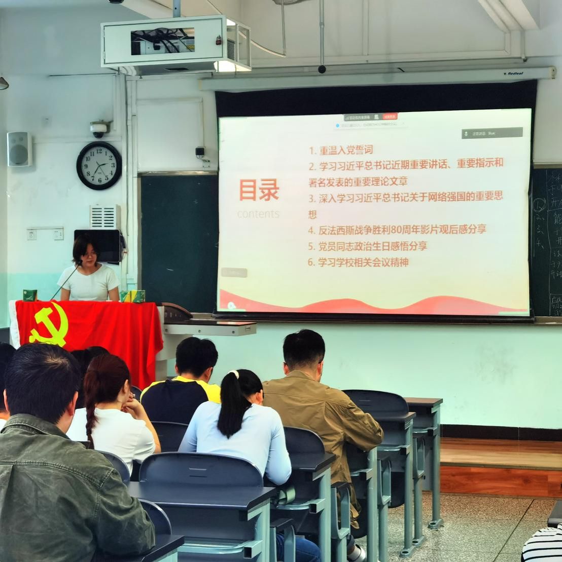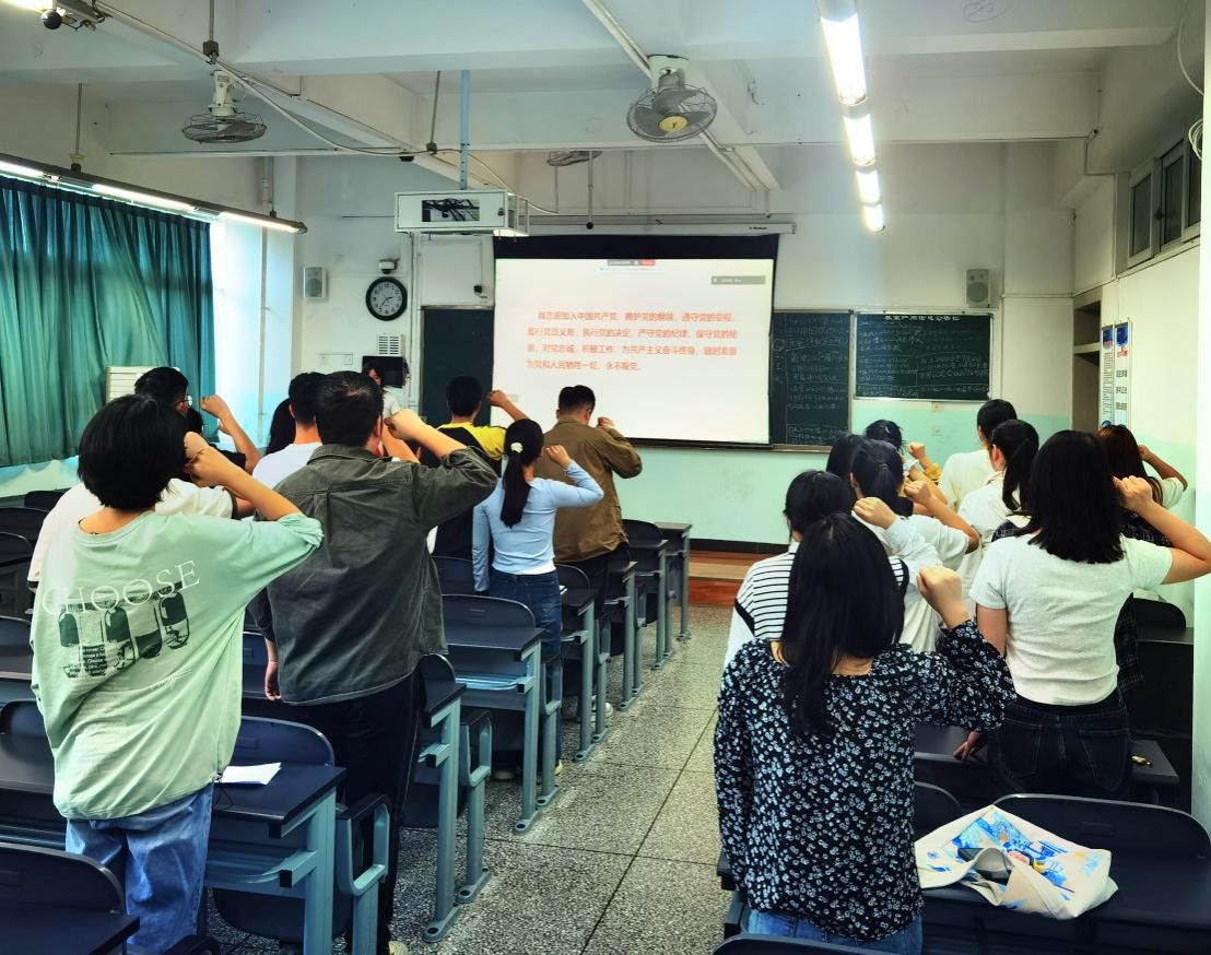 活动伊始,全体党员重温入党誓词。面对鲜红的党旗,同志们高举右拳,庄严宣誓:“我志愿加入中国共产党……”铿锵誓言在教室内回响,激励每位党员铭记初心、担当使命。