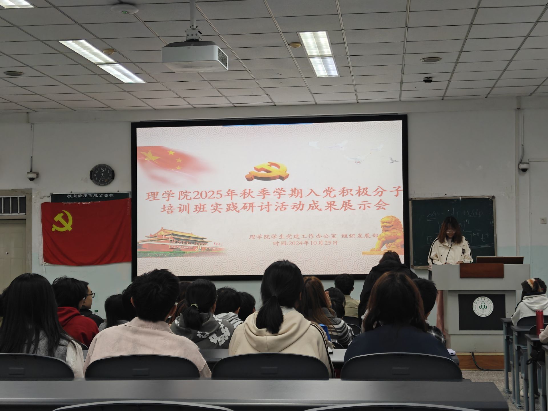 10月21日中午,学院在10-A103教室举行了2025年秋季学期入党积极分子培训班实践环节成果展示会。各专业学生党支部书记、党员代表,学生党建工作办公室主任及全体培训班学员参加了此次会议。会议由学院学生党建工作办公室组织发展部郭湘主持。