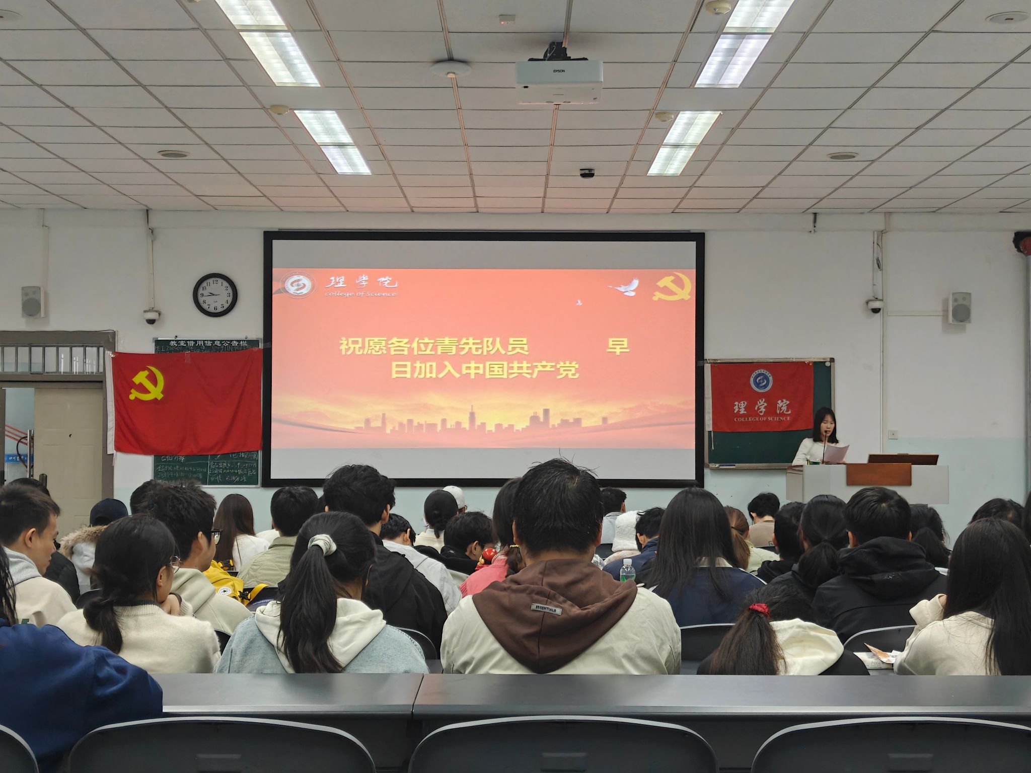 10月31日中午,学院于10-A104举办理学院2025年秋季学期确定的入党积极分子加入青年先锋队入队仪式暨培训会。理学院党委办公室副主任杨岚楠、各专业学生党支部党员代表及学生党建工作办公室全体成员参加仪式,学生党建办公室青年先锋队覃薇主持仪式。