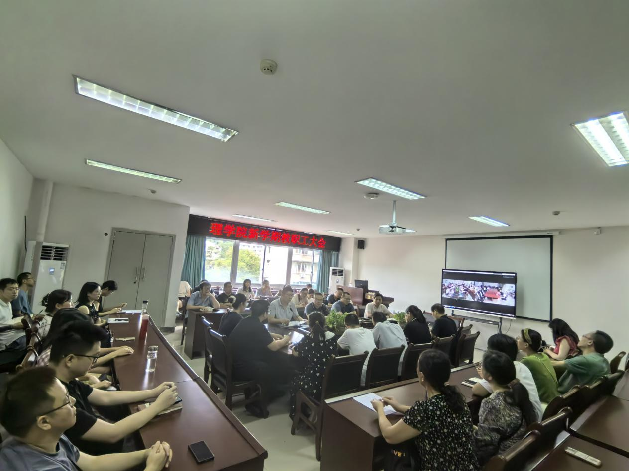 胡永波首先代表学院领导班子向暑假期间辛勤付出的老师们、同学们表达了诚挚的敬意和慰问。随后,他传达了学校党委理论学习中心组(扩大)暨中层干部会议精神,深入解读了《关于贯彻落实党的二十届三中全会精神推进教育科技人才体制机制一体改革的意见(征求意见稿)》、《学科专业建设管理办法》两个文件。他表示,学院后期将举办专门的学习研讨,结合两个文件,集思广益、凝心聚力,共同谋划思考学院的改革与发展。同时,胡永波全面回顾了学院上半年取得的成就,强调这些成果是全体教职工团结协作、不懈努力的结晶,也是理学人代代相传、接续奋斗精神的生动体现。最后,他进一步从党建引领、招生就业、学生工作、工会建设及安全稳定等多个方面,对学院工作进行了总结与部署。
