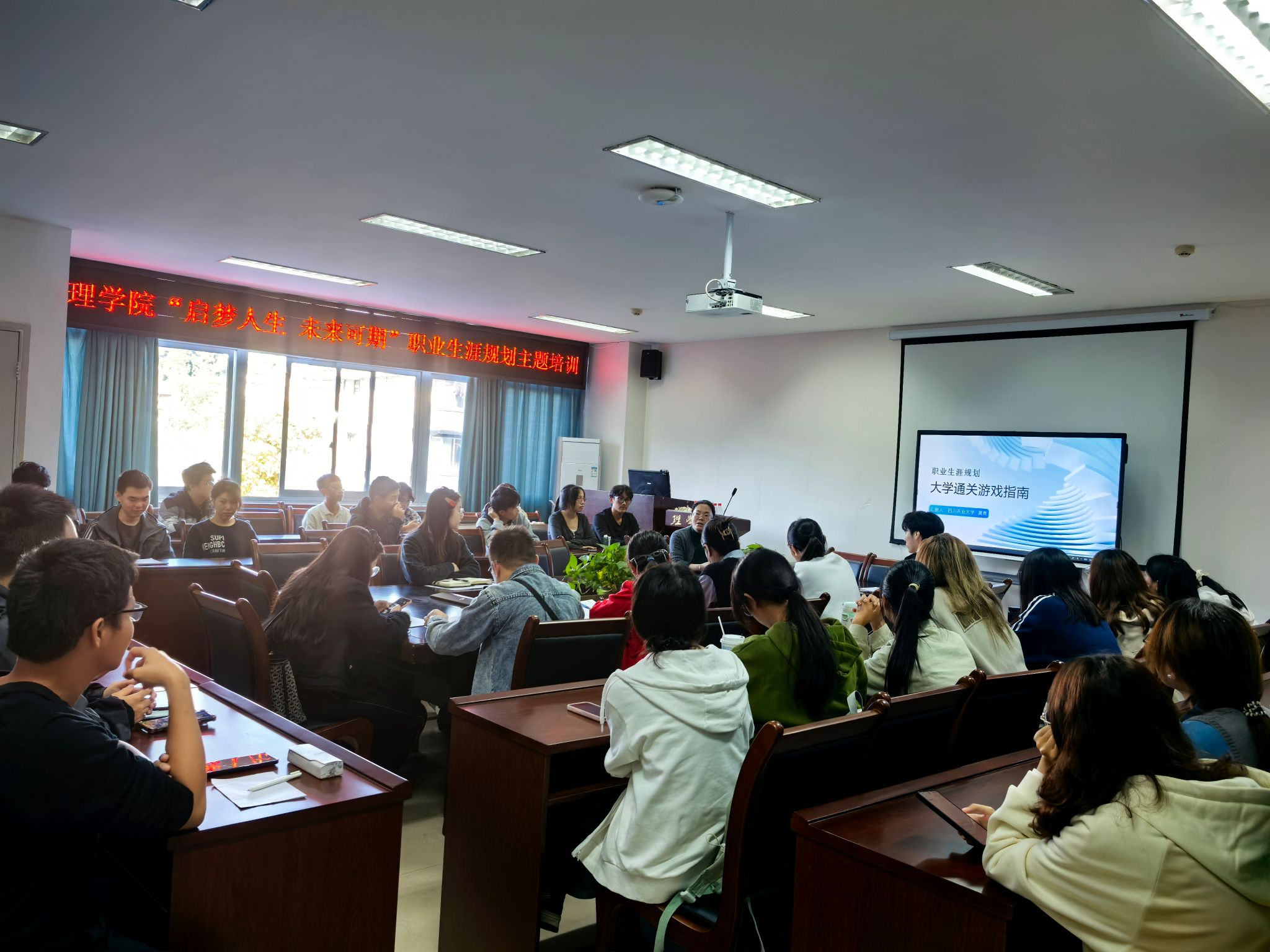 为助力指导学生树立正确的成才观、就业观和职业规划意识,科学规划自己的职业生涯和学业生涯,10月22日下午,学校大学生就业与创业教研室副主任、大学生职业生涯规划课程组组长黄青博士受邀为学院新生班主任,2023、2024级的班长/团支书开展“启梦人生 未来可期”职业生涯规划主题培训讲座。