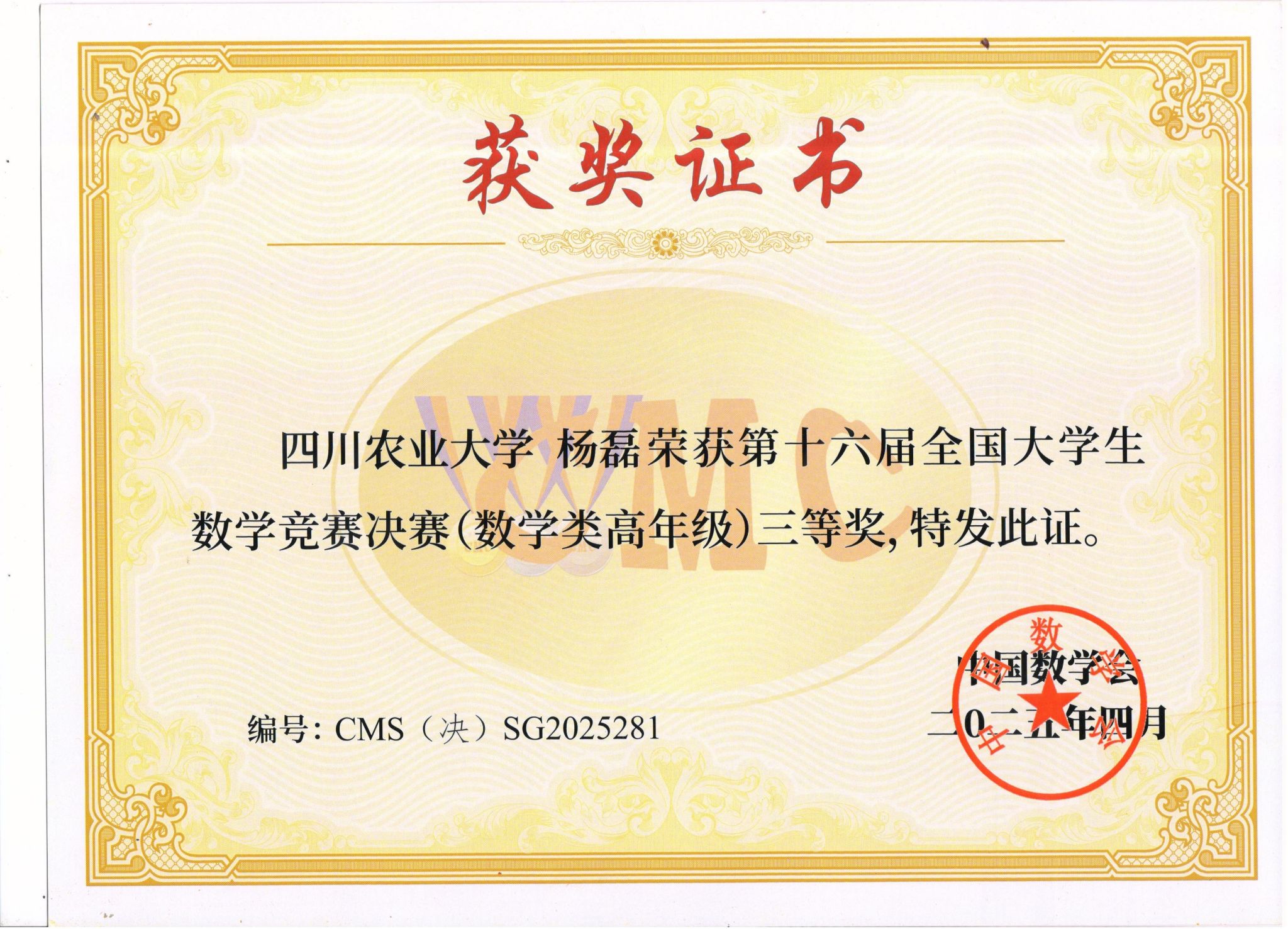 在竞争尤为激烈的全国决赛中,我校信息与计算科学专业杨磊同学凭借深厚的数学功底与出色的临场发挥,荣获国家三等奖,实现我校数学专业组在国家级奖项中“零的突破”。