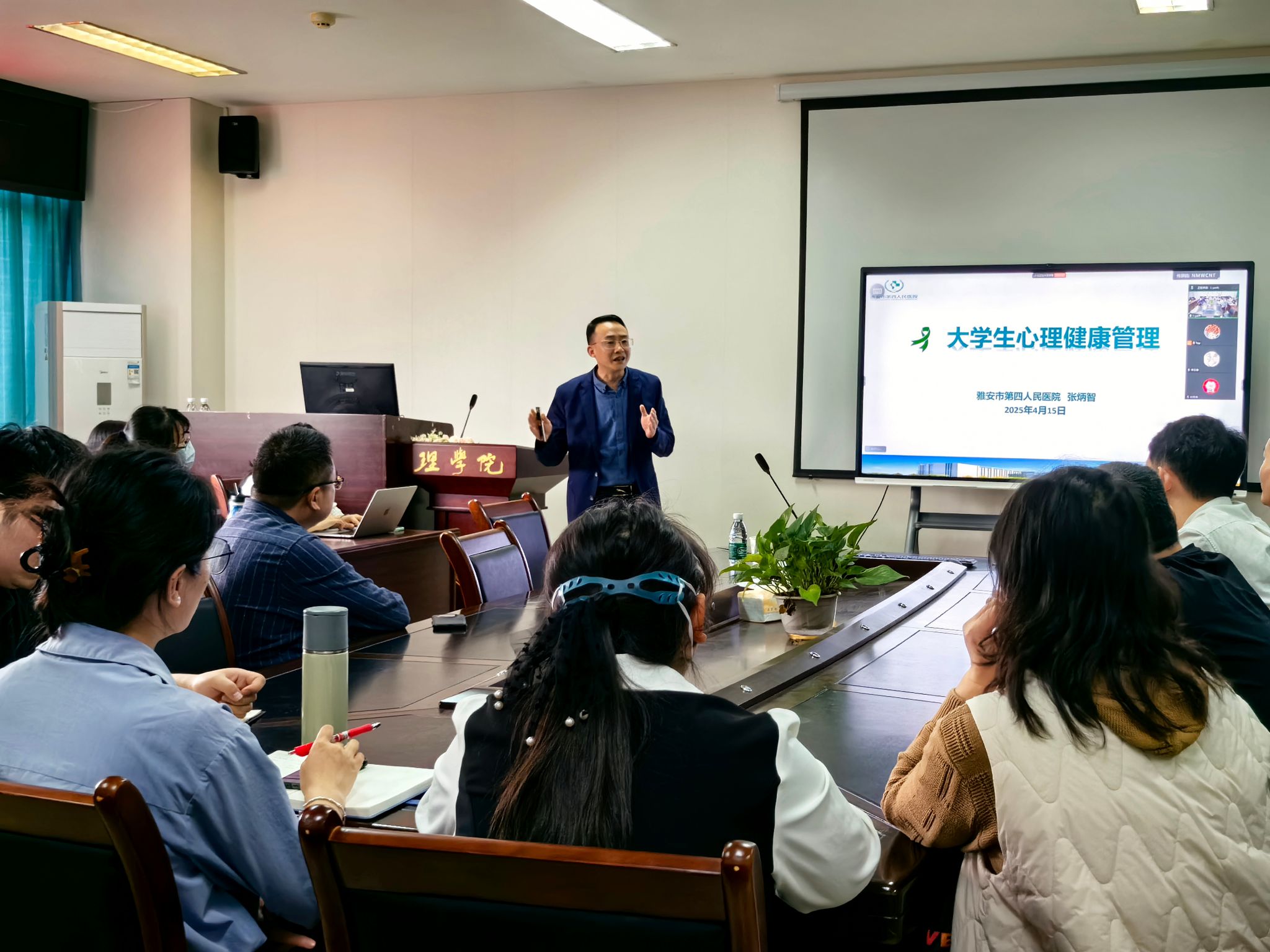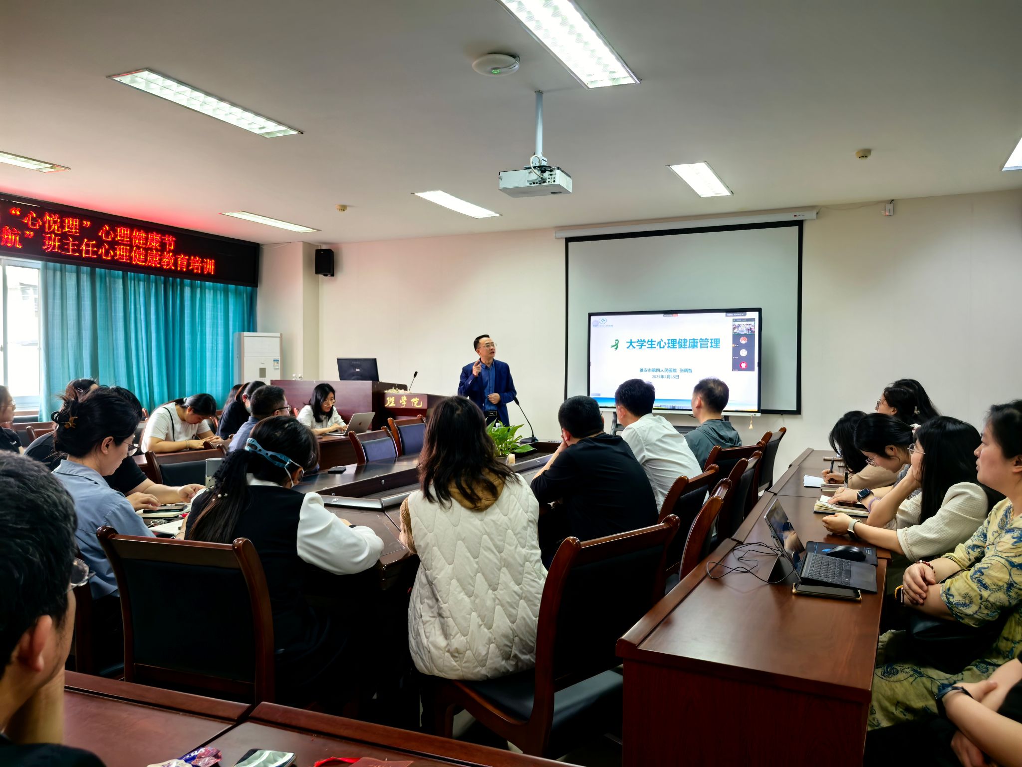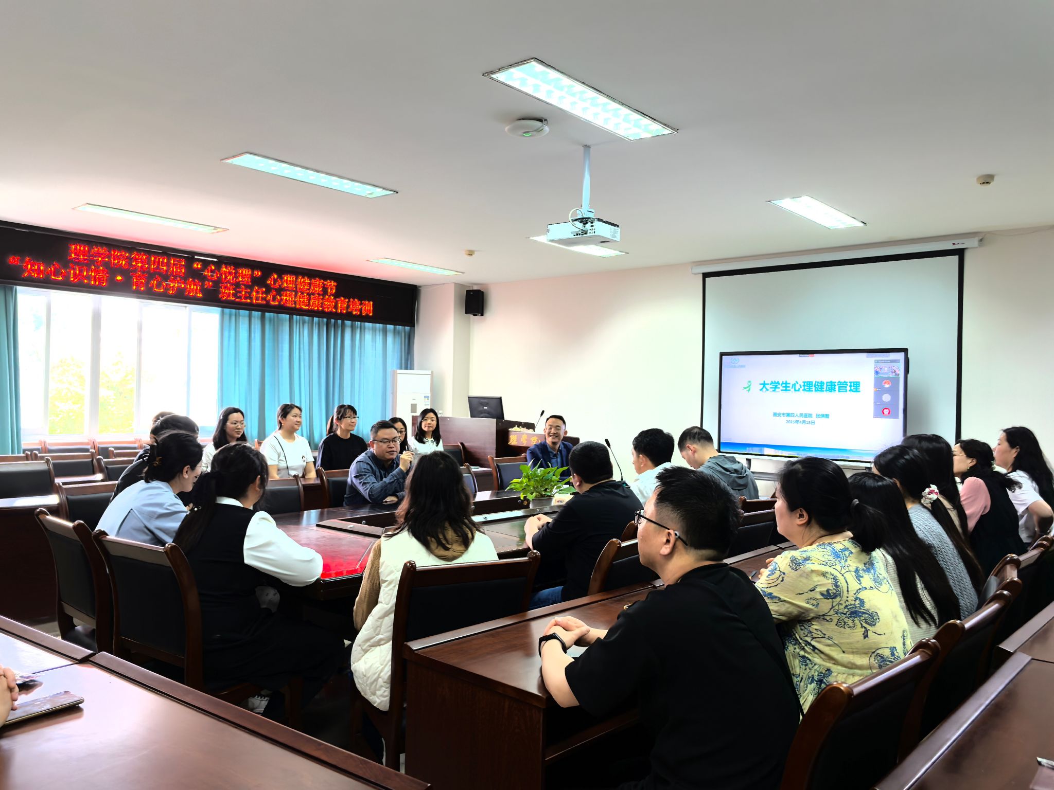 4月15日下午,雅安市第四人民医院张炳智副院长应邀来院为班主任开展心理健康教育专题培训。学院党委书记胡永波主持会议,学院近40名班主任参加培训。