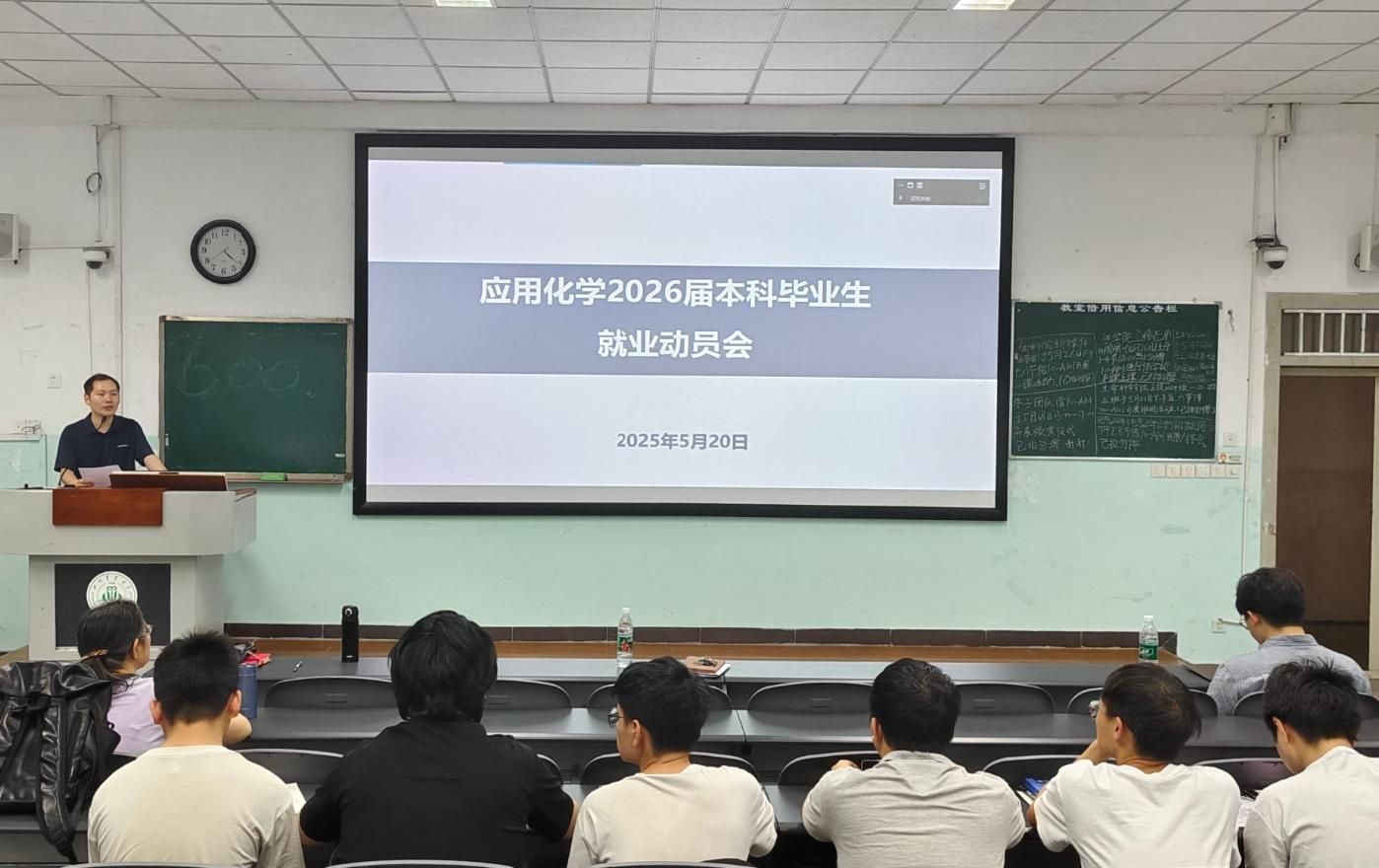 5月20日下午,应用化学系在10教A101召开了2026届应用化学专业本科毕业生就业动员会,会议聚焦升学就业规划与跨学科发展,特邀四川盈嘉合生科技有限公司副总经理裴亮、ok138cn太阳集团529环境学院蔡郡倬博士以及考研学子代表分享经验。会议由应用化学系主任蒲祥主持,理学院分析测试中心主任孙萌萌、2022级应化学生参会。