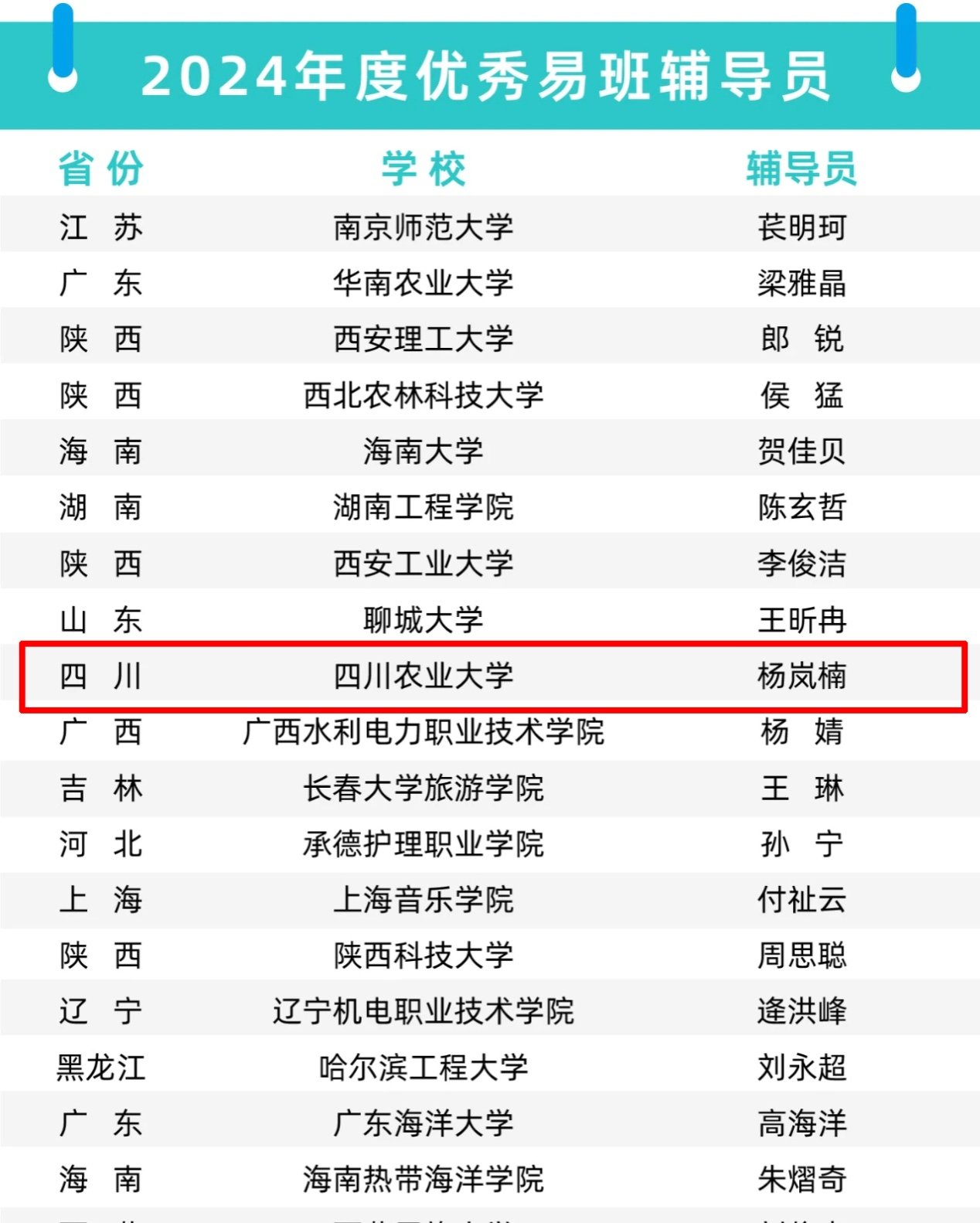 近日,教育部易班发展中心正式公布2024年度全国易班共建优秀评选结果。经过各省推荐、专家评审,学院辅导员杨岚楠获“全国优秀易班辅导员”称号,全国共77人。