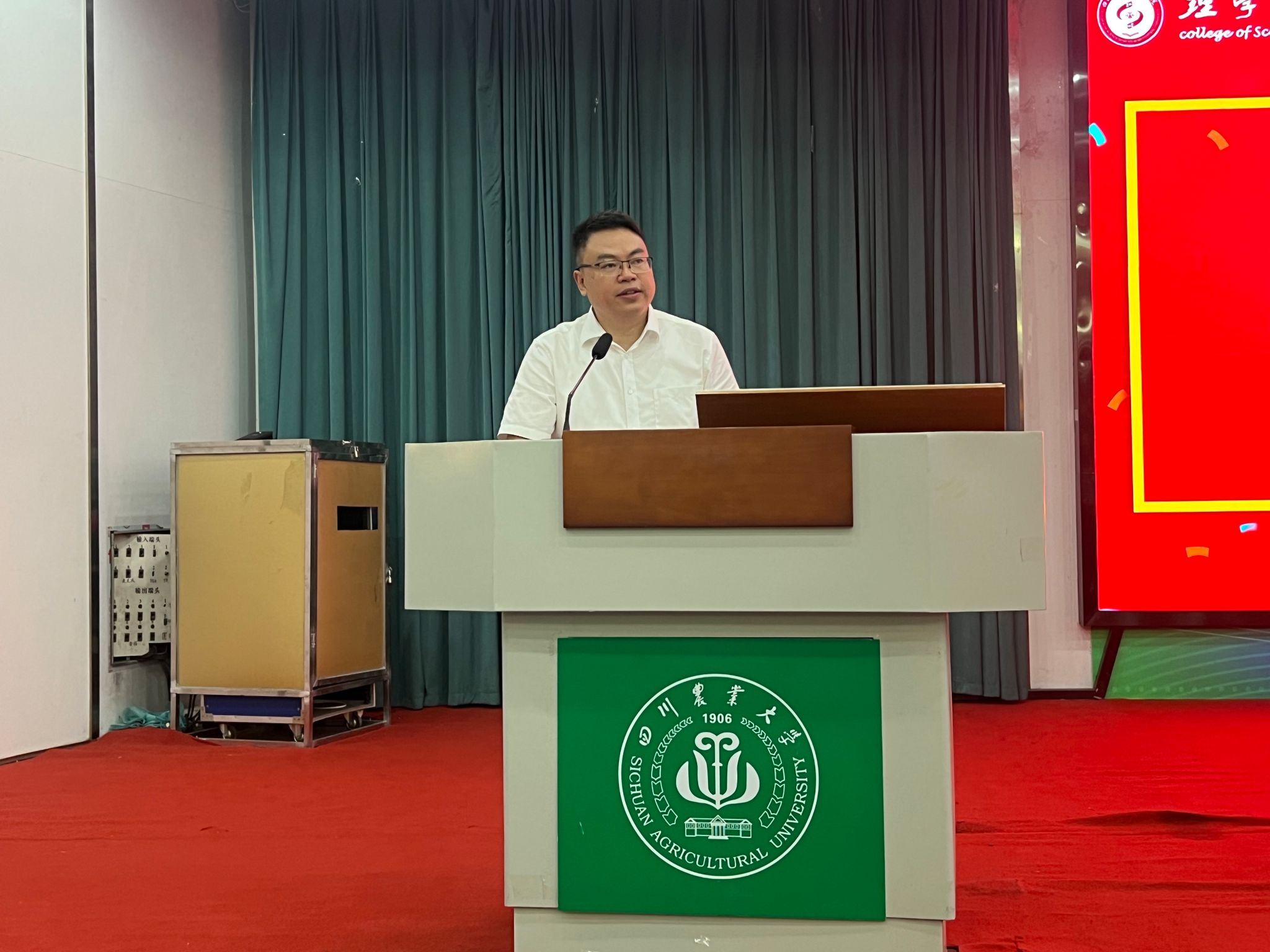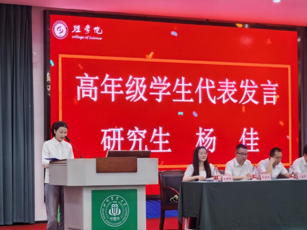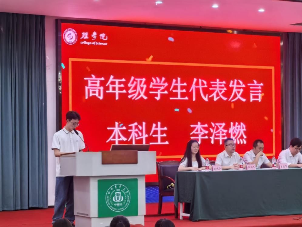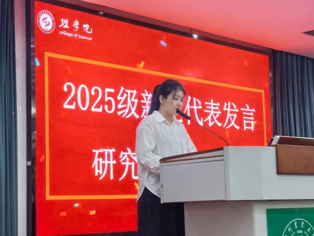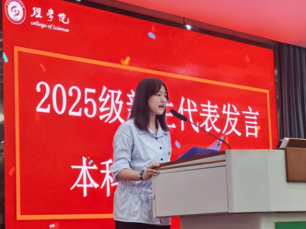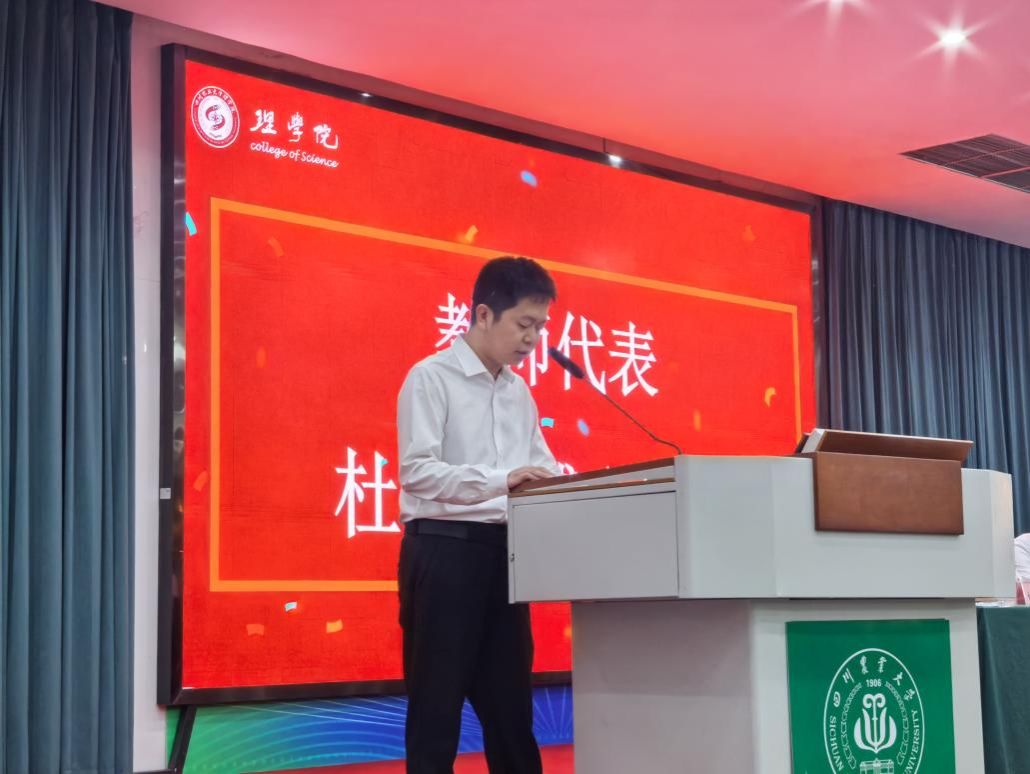 教师代表杜利杰对各位新同学的到来表示了热烈的欢迎,并以自身成长经历为切入点,与同学们分享了从川农大本科求学、理学院攻读硕士,到四川大学深造后重返母校任教的“圆梦之旅”。他勉励同学们珍惜大学时光,既要沉下心钻研理论知识,也要勇于在实验与实践中探索未知,以严谨求实的态度追逐学术梦想,在理学院实现人生的蜕变与成长。