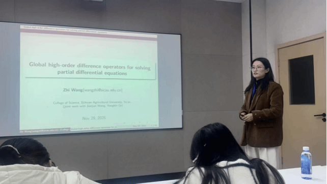 在“计算数学前沿专题”分会场,王芝博士作了题为《Global high-order difference operators for solving partial differential equations》的学术报告。报告系统阐释了微分方程高阶求解过程中面临的关键问题,提出通过构建拟紧致的差分算子,有效克服了高阶格式中源项导数处理的现有局限,实现了非线性与时间有关微分方程的高阶计算,并得出局部低阶收敛并不会影响全局高阶收敛的重要结论。