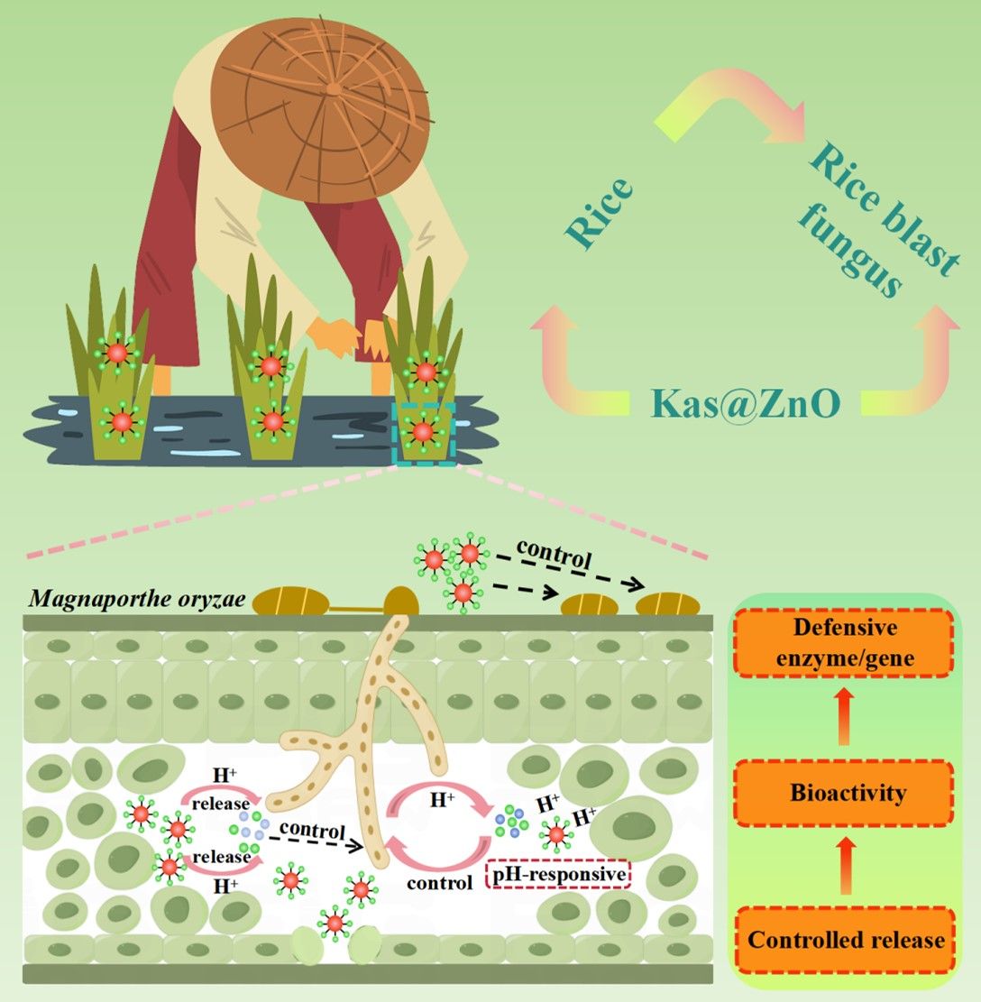 本研究开发出了一种环境友好的pH响应型农药递送系统(Kas@ZnO),通过将广泛用于控制稻瘟病的春雷霉素(Kas)与羧基功能化的氧化锌量子点偶联,实现精准控释。该系统通过酰胺键连接,能够在酸性环境中快速释放药物,提高了农药利用率。生物活性试验表明,Kas@ZnO不仅显著抑制了菌丝生长和孢子萌发,活体盆栽实验亦显示其对稻瘟病的持效期更优。此外,Kas@ZnO还提高了水稻防御酶活性和防御基因的表达水平,从而增强水稻在病害胁迫中的抗病性能。这一研究为稻瘟病绿色防控和精准农业提供了新策略,具有重要的应用潜力。