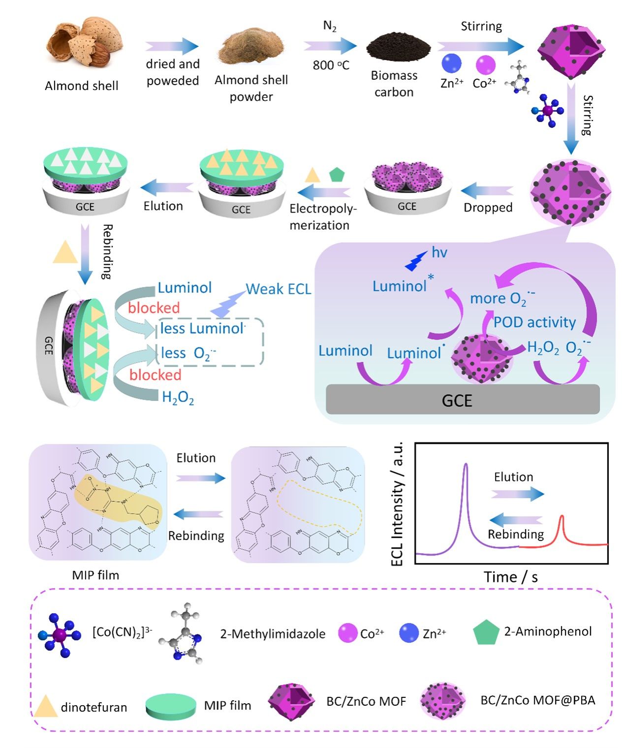 团队基于分子印迹耦合电化学发光开发出MIECL传感新技术,实现对食品致害因子的高灵敏和高选择性识别与检测。该研究中,首先采用自组装和原位生长的方法制备出中空多层且具有过氧化物酶活性的锌钴有机框架负载生物质炭包覆普鲁士蓝的纳米酶(BC/ZnCo MOF@PBA),利用分子印迹聚合物(MIP)技术将其构建于鲁米诺-H2O2电化学发光(ECL)体系中。其中,BC/ZnCo MOF@PBA可以作为共反应促进剂催化H2O2产生大量的羟基自由基(·OH),从而显著放大鲁米诺阴极信号并提高信号的稳定性。得益于MIP对呋虫胺的特异性选择,该分子印迹电化学发光模式具有相当好的灵敏度和选择性,检测限(LOD)为0.0046 μMS/N = 3)。