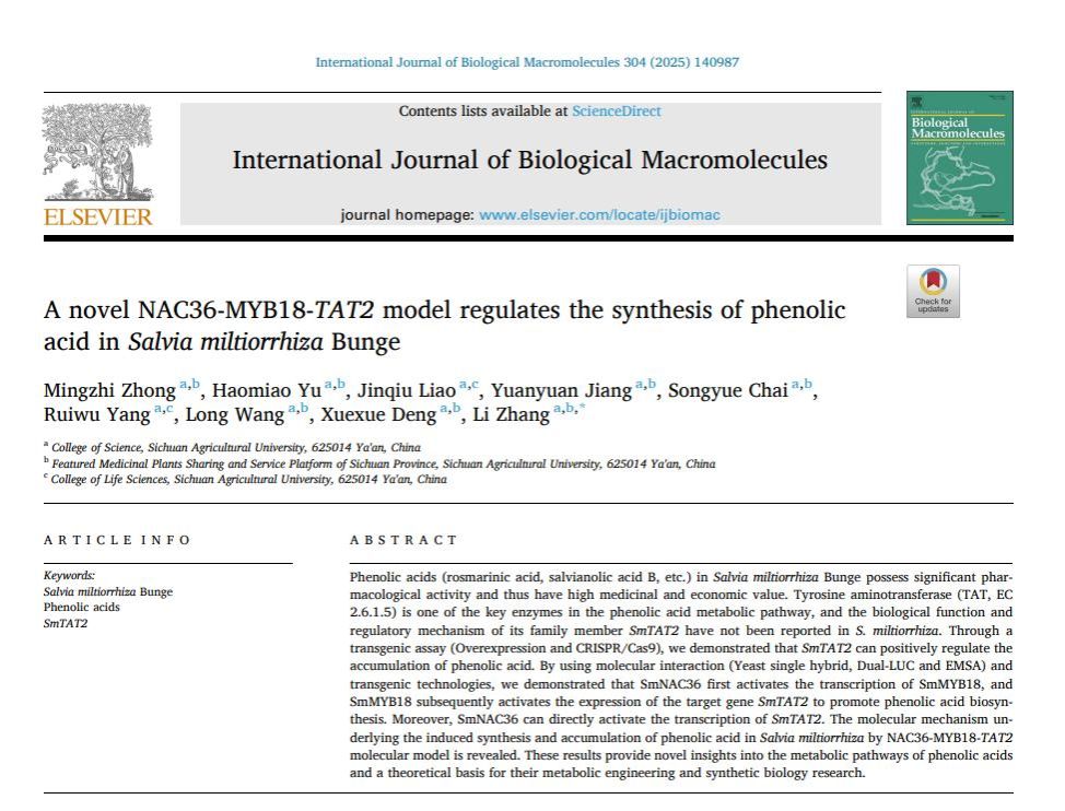 我校理学院“特色药用植物种质资源创新与利用”团队以ok138cn太阳集团529为第一完成单位,在生物化学与分子生物学领域国际权威期刊《International Journal of Biological Macromolecules》(中科院一区TOP,IF=7.7)发表题为“A novel NAC36-MYB18-TAT2 model regulates the synthesis of phenolic acid in Salvia miltiorrhiza Bunge”的研究论文。该研究通过整合多组学分析、分子互作验证及遗传转化技术,揭示了丹参酚酸生物合成途径中关键转录因子SmNAC36与SmMYB18协同调控靶基因SmTAT2表达的作用机制,并构建了“NAC36-MYB18-TAT2”级联调控网络模型,为丹参合成生物学研究以及高酚酸新品种的分子设计育种提供了理论支撑。理学院生物资源化学专业博士研究生钟明志为论文第一作者,张利教授为通讯作者。(论文链接:https://doi.org/10.1016/j.ijbiomac.2025.140987)。