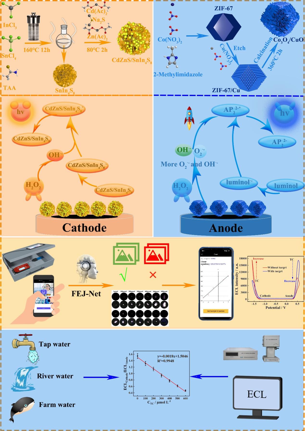 四环素(TC)残留物在环境中的积累对公共安全构成严重威胁。该研究团队开发了一种智能手机集成的比率电化学发光(RECL)传感系统,用于TC的视觉和即时检测。采用溶剂热法在二维SnIn4S8中键合零维CdZnS,构建了具有丰富硫空位的CdZnS/SnIn4S8异质结,其作为阴极的电化学发光(ECL)发光材料。采用原位热解法制备了富含氧空位和多酶活性Co3O4/CuO纳米酶,作为ECL负极材料。异质结介导CdZnS和SnIn4S8之间的电荷转移以实现增强调节。制备的Co3O4/CuO纳米酶偶联的鲁米诺发光团在催化过氧化氢转化为超氧阴离子(O2•-)和羟基自由基 (•OH)方面表现出优异的能力。基于团队自主研发的快速电化学发光判断网络(FEJ-Net)的智能手机可以捕获RECL光信号,实现了一种便携、智能、即时传感的新方法。