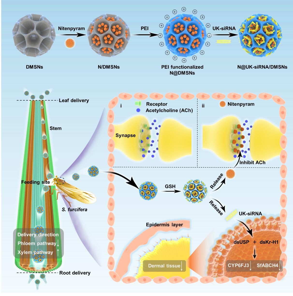 白背飞虱严重威胁着水稻生产。目前控制白背飞虱最有效的方法是大量喷洒杀虫剂,但这种方法会造成大规模的抗药性。RNA干扰杀虫剂在控制害虫抗药性方面具有巨大潜力。然而,RNA跨界运输的不稳定性及低效率是其在农业害虫管理中应用的主要障碍。针对这一问题,本研究提出了一种基于树枝状介孔二氧化硅纳米粒子的纳米载体,用于递送siRNA和烯啶虫胺(化学杀虫剂),以抑制白背飞虱的代谢解毒和发育,从而阻止其增殖。这种负载RNA干扰杀虫剂和烯啶虫胺的复配型纳米农药显著提高了siRNA的稳定性(药效可持续21天),并在 GSH 或飞虱体液中释放负载的杀虫剂,最大释放率为 84.99%。此外,针对两个转录因子(Ultraspiracle 和 Krüppel-homolog 1)的释放siRNA 下调了发育基因 Ultraspiracle(0.09倍)和 Krüppel-homolog 1(0.284倍),以及下游解毒基因 ABC SfABCH4(0.016倍)和 P450 CYP6FJ3(0.367倍)。该复配型纳米农药抑制了害虫的发育和解毒抗性,显著提高白背飞虱对烯啶虫胺的敏感性至纳克级(LC50 为 250–252 ng/mL),产生了5.37–7.13倍的增效作用。本研究提出了新的白背飞虱综合管理策略,为水稻的绿色安全生产提供了新思路。