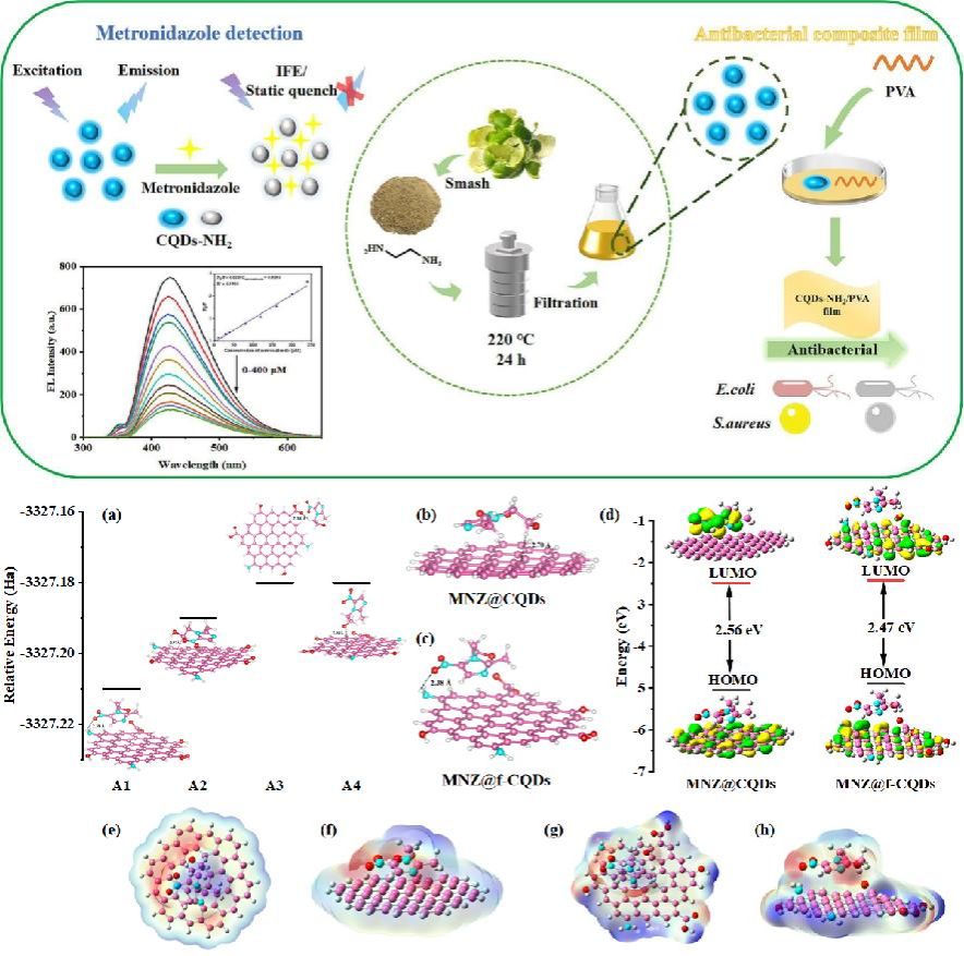 作为一种光谱抗生素,甲硝唑主要被用于治疗人类和动物的厌氧菌感染。此外,它还被用作饲料添加剂,以促进动物生长并消除寄生虫。然而,甲硝唑的不合理使用可能引起一系列毒害反应,如痉挛、周围神经病变和共济失调等,对人类健康构成严重威胁。因此,对甲硝唑实施准确的量化检测对于保障人类健康和食品安全至关重要。本研究以橘皮和乙二胺为原料,采用一步水热法制备得到氨基功能化的碳量子点,构建了一种用于检测甲硝唑的荧光传感策略。合成的碳量子点对甲硝唑表现出较高灵敏度和选择性,其检测限为0.19 μM,线性范围为0-240 μM。碳量子点与甲硝唑之间相互作用导致荧光猝灭,是内滤效应与静态猝灭共同作用的结果,密度泛函理论(DFT)计算进一步阐明了该传感机制并验证了实验结果。此外,将碳量子点作为功能填料掺入聚乙烯醇制备的复合薄膜表现出良好的机械和紫外线阻隔性能,对大肠杆菌和金黄色葡萄球菌有良好的抑菌效果。