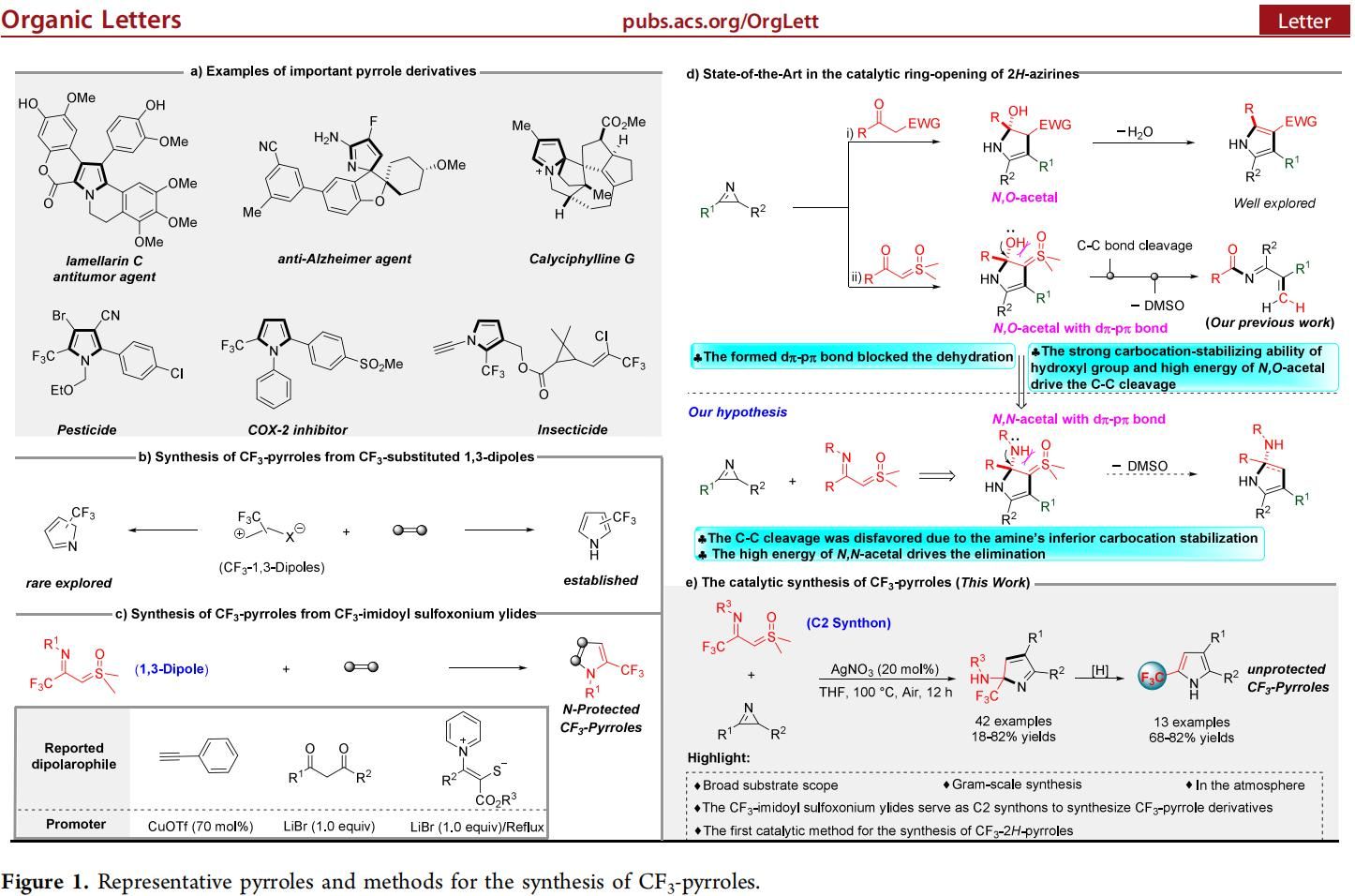 含氮杂环是药物化学的关键骨架,FDA数据显示:1938-2013年间59%的小分子药物含氮杂环,2013-2023年该比例升至82%,且半数以上新药含多重氮环。三氟甲基(CF3)凭借高电负性、亲脂性和代谢稳定性,可显著提升含氮杂环药物的生物活性,故CF3取代的含氮杂环的合成具有重要研究价值。其中,作为多类药物分子核心结构的吡咯类化合物,其CF3衍生物的高效合成备受关注。目前,结构稳定的芳香类CF3-1H-吡咯的合成已有较多报道,而非芳香性的CF3-2H-吡咯因其结构稳定性差、易异构化等因素限制,其催化合成一直未能实现。