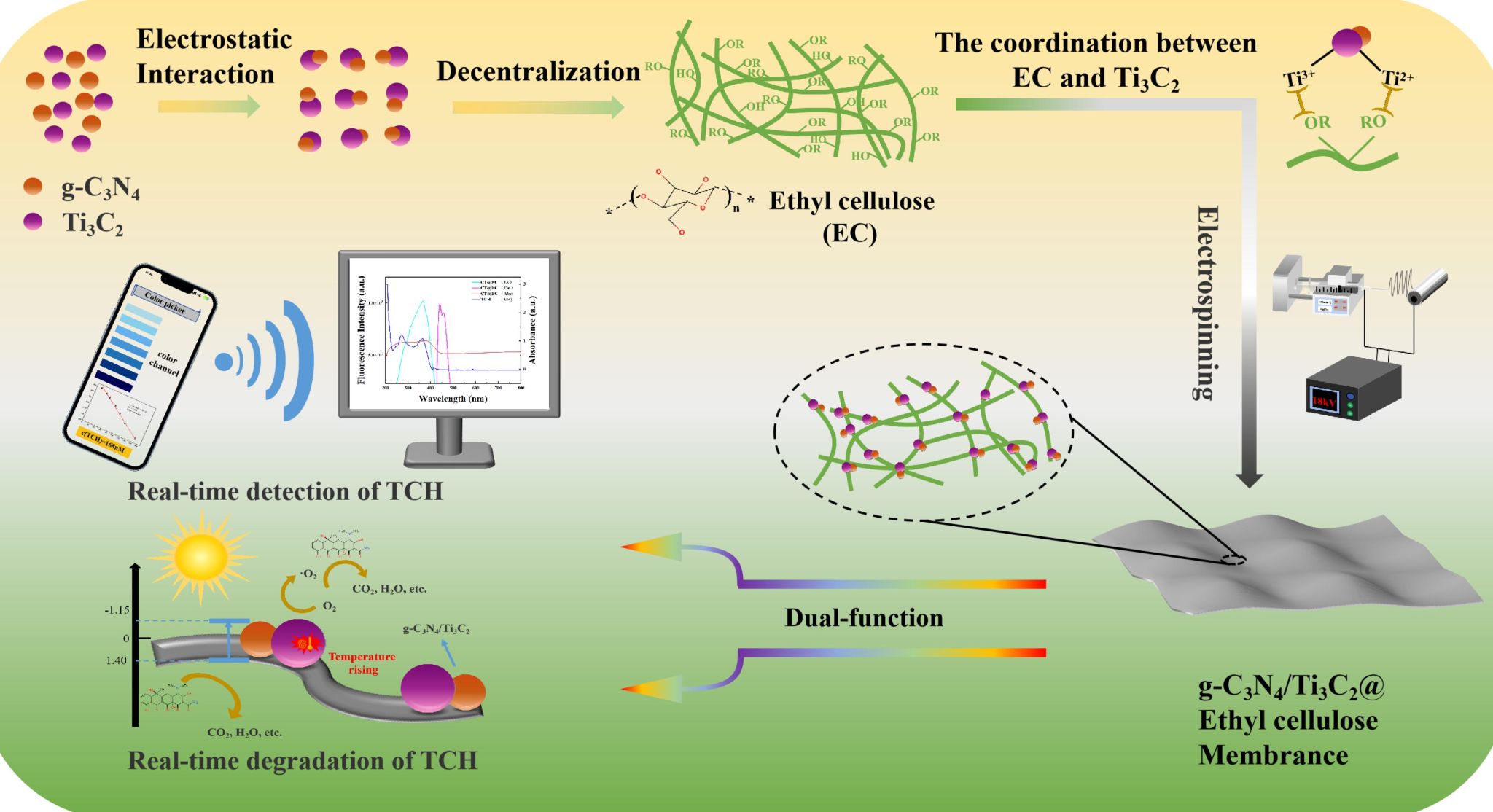 近日,ok138cn太阳集团529理学院联合水利水电学院、以色列本·古里安大学成功研发了一种具有光热催化降解与荧光传感双功能于一体的g-C₃N₄/Ti₃C₂@乙基纤维素纳米纤维复合膜(CT@EC),该材料可在可见光照射下高效降解水体中的盐酸四环素(TCH),并实现对其的实时、可视化检测,同时具备产氢性能。该研究成果发表于国际期刊《Separation and Purification Technology》(IF:9),题为《A g-C₃N₄/Ti₃C₂@EC fiber composite membrane: Mechanism of simultaneous photothermal degradation and fluorescent detection of hydrochloride tetracycline in wastewater》全文链接:https://doi.org/10.1016/j.seppur.2025.135309