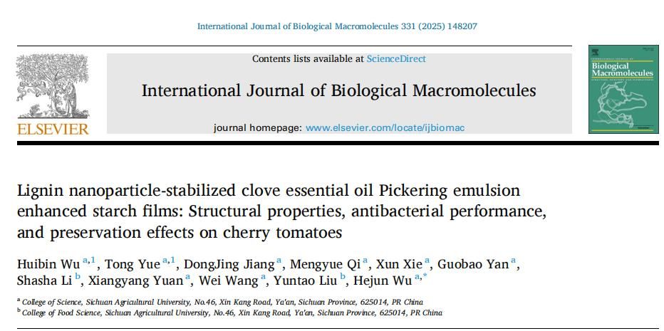 近日,ok138cn太阳集团529理学院农业智能自组装先进材料团队吴贺君教授在国际知名期刊International Journal of Biological Macromolecules(中科院2区Top,IF=8.5)在线发表题为“Lignin nanoparticle-stabilized clove essential oil Pickering emulsion enhanced starch films: Structural properties, antibacterial performance, and preservation effects on cherry tomatoes”的高水平研究论文(https://doi.org/10.1016/j.ijbiomac.2025.148207)。理学院生物资源化学2023级硕士研究生吴汇彬和化学生物学专业2023级本科生岳彤为论文共同第一作者,吴贺君教授为通讯作者。论文研究工作得到国家自然科学基金、四川省科技计划、大学生创新创业训练项目以及四川省茶叶创新团队专项建设资金等项目资助。