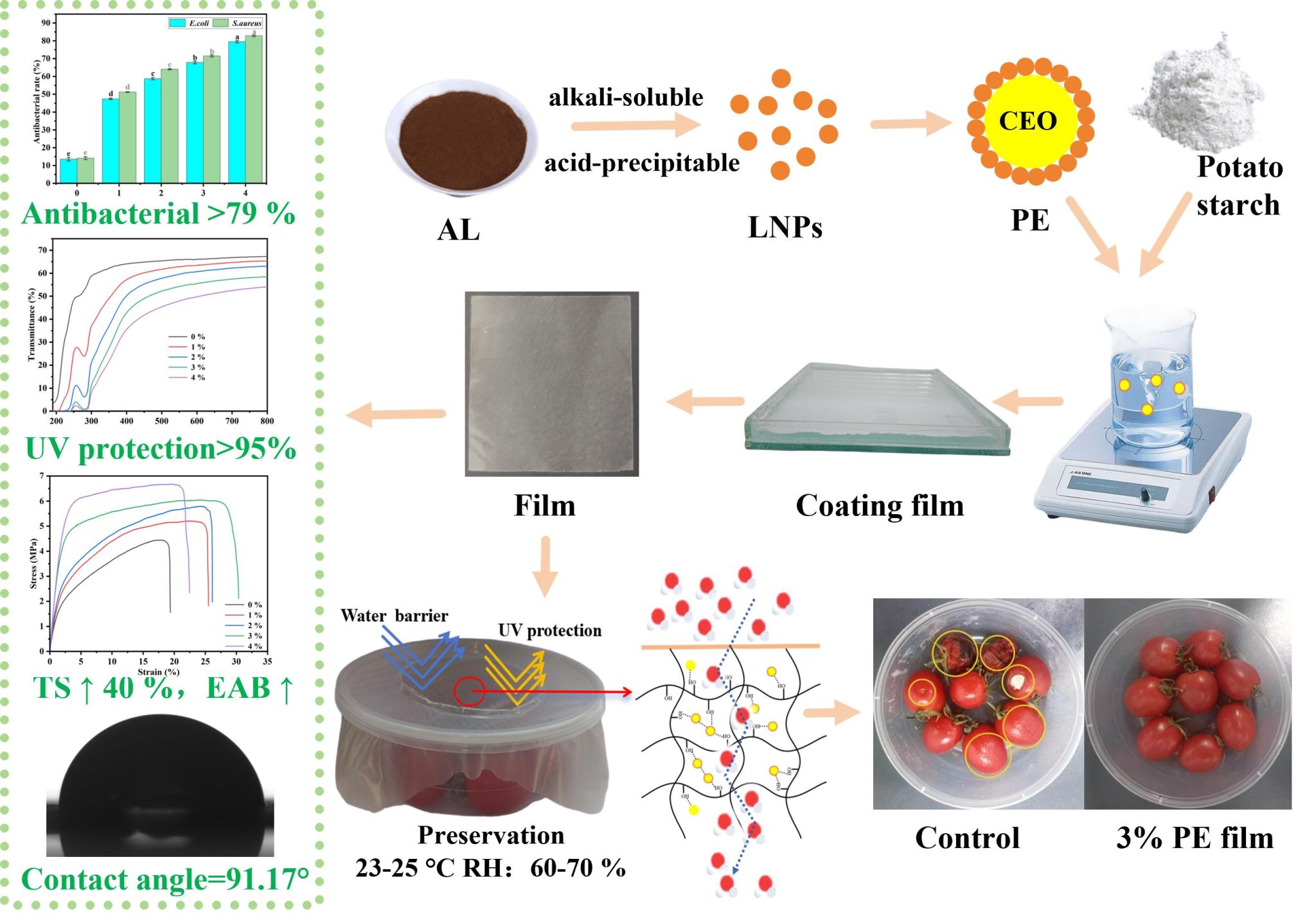 基于上述背景,本团队采用木质素纳米颗粒(LNPs)稳定丁香精油(CEO),通过Pickering乳液技术构建自组装递送体系,将CEO高效负载于淀粉基薄膜,开发高性能活性复合薄膜。系统研究了乳液添加量对复合薄膜结构、理化和功能特性的影响。此外,还评估了复合薄膜对圣女果保鲜的实际应用效果。
