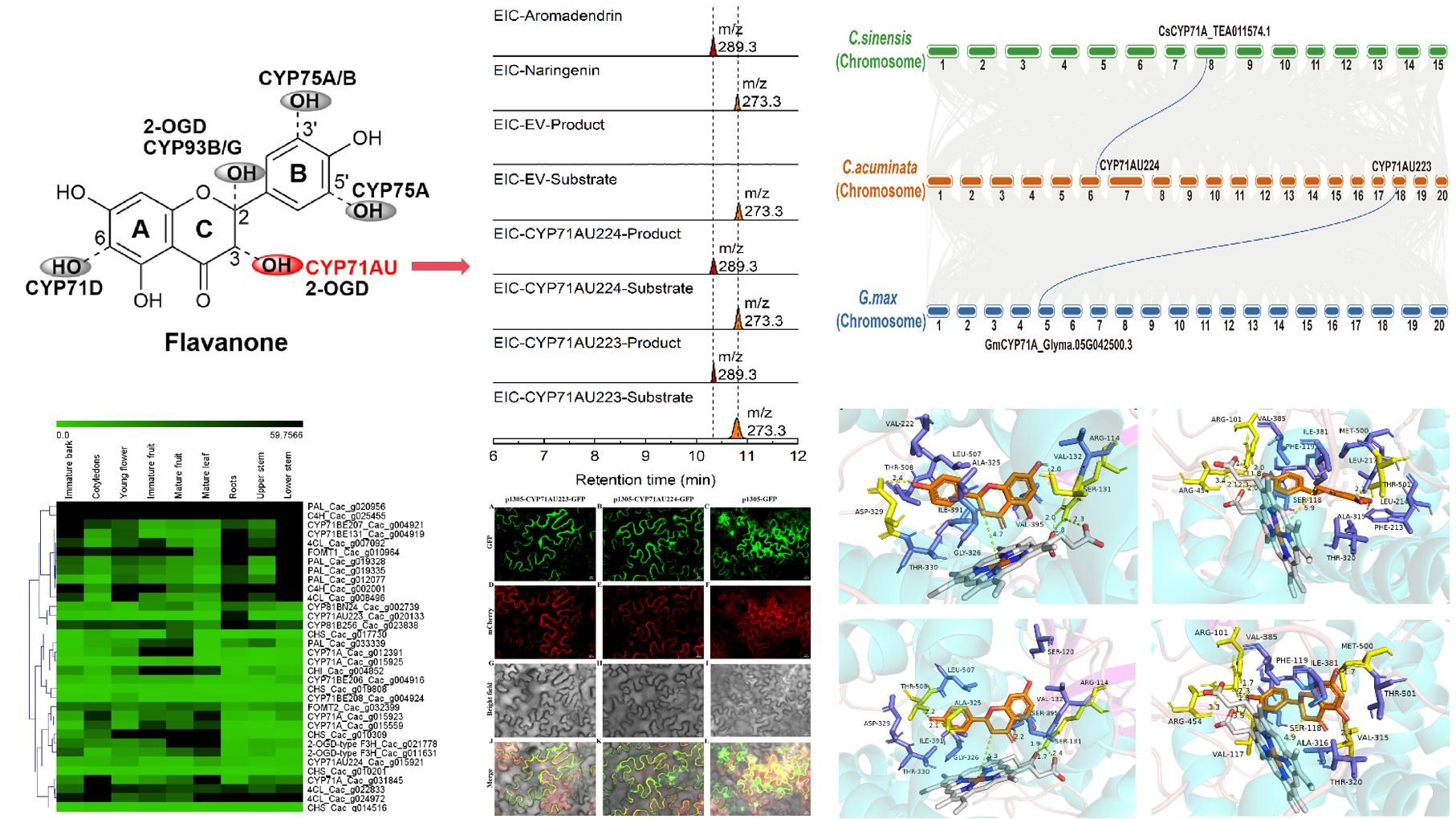 喜树不仅可产生具有抗癌活性的一线抗癌药物,该植物中黄酮合成代谢也十分活跃,我们从中发现了48种被不同程度羟化修饰的黄酮类成分。由此表明喜树中存有丰富的黄酮羟化酶元件。团队基于前期构建的喜树多组学数据库,从数万条候选基因中发现了2条隶属于CYP450家族的羟化酶元件CYP71AU223和CYP71AU224。经过功能表征,发现它们能将柚皮素转化为香橙素,即实现黄酮中心前体柚皮素的C3位羟化修饰。由于经典型黄酮C3位羟化酶(F3H)隶属于2-OGD家族,因此,我们将其划归为非经典的CYP450型F3H。通过跨物种共线性分析,我们还从另外两种富产黄酮的植物野茶树和大豆中发现了同样具有黄烷酮C3位羟化修饰功能的CsCYP71A和GmCYP71A。由此表明,非经典的CYP450型F3H不仅存在于喜树,其还同样存在于其他富产黄酮的植物中。团队通过理性突变解析了它们的底物锚定位点,突变过程中还意外发现,拓宽底物通道不仅能提升其催化活性,还能拓展底物识别谱。