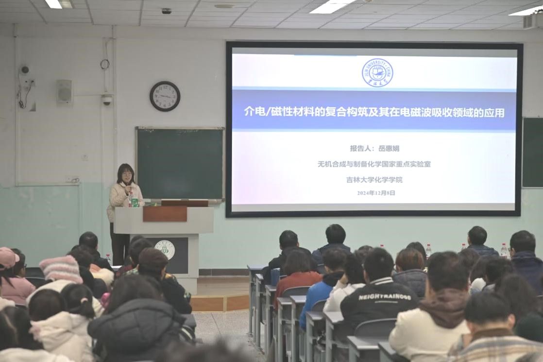 报告会上,岳惠娟教授首先进行了《介电/磁性材料的复合构筑及其在电磁波吸收领域的应用》的报告,向与会师生介绍了多层次石墨烯与铁磁合金复合体系、金属络合物衍生复合体系、核壳结构复合体系、内源诱导的介导/磁复合体系及超轻薄碳纤维复合材料等研究。随后,张冬教授和程路博士就新型二次电池作了专题报告。他们基于“双碳”目标,开发出了安全性高、成本低、绿色环保的水系电池体系。
